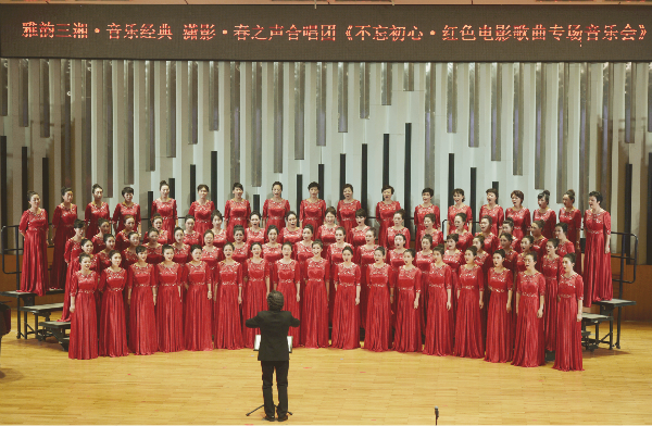 中国网7月2日讯 近日,“雅韵三湘·音乐经典”潇影·春之声合唱团《不忘初心·红色电影歌曲专场音乐会》在湖南音乐厅落下帷幕。本次音乐会是“雅韵三湘·音乐经典”2018湖南音乐季的系列演出活动,也是潇湘电影集团成立六十周年的庆典活动。
